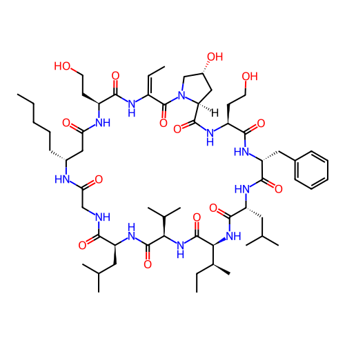 | SMILES | C/C=C1/NC(=O)[C@H](CCO)NC(=O)C[C@@H](CCCCC)NC(=O)CNC(=O)[C@H](CC(C)C)NC(=O)[C@@H](C(C)C)NC(=O)[C@H]([C@@H](C)CC)NC(=O)[C@@H](CC(C)C)NC(=O)[C@@H](CC2=CC=CC=C2)NC(=O)[C@H](CCO)NC(=O)[C@@H]2C[C@@H](O)CN2C1=O |