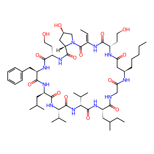| SMILES | C/C=C1/NC(=O)[C@H](CCO)NC(=O)C[C@@H](CCCCC)NC(=O)CNC(=O)[C@H](CC(C)CC)NC(=O)[C@@H](C(C)C)NC(=O)[C@H](C(C)C)NC(=O)[C@@H](CC(C)C)NC(=O)[C@@H](CC2=CC=CC=C2)NC(=O)[C@H](CCO)NC(=O)[C@@H]2C[C@@H](O)CN2C1=O |