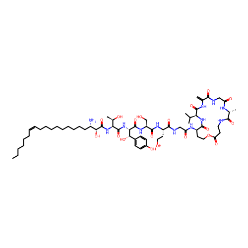 | SMILES | C=C1NC(=O)[C@H](C(C)C)NC(=O)[C@H](NC(=O)CNC(=O)[C@H](CCO)NC(=O)[C@H](CO)NC(=O)[C@@H](NC(=O)[C@@H](NC(=O)[C@@H](O)[C@@H](N)CCCCCCCCC/C=C\CCCCCC)[C@@H](C)O)[C@@H](O)C2=CC=C(O)C=C2)CCOC(=O)CCNC(=O)[C@@H](C)NC(=O)CNC1=O |