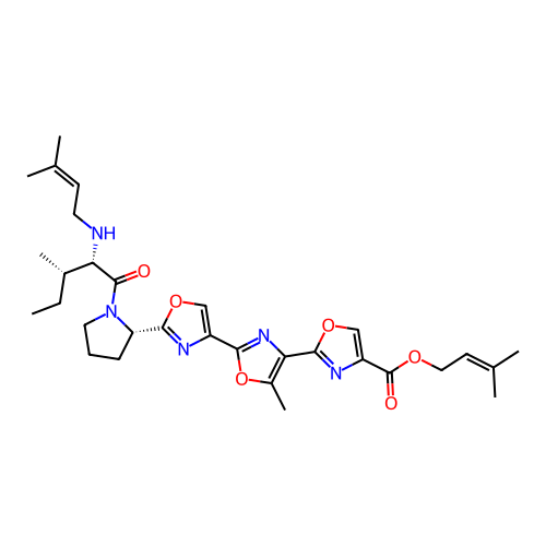 | SMILES | CC[C@H](C)[C@H](NCC=C(C)C)C(=O)N1CCC[C@H]1C1=NC(C2=NC(C3=NC(C(=O)OCC=C(C)C)=CO3)=C(C)O2)=CO1 |