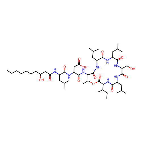 | SMILES | CCCCCCCC(O)CC(=O)NC(CC(C)C)C(=O)NC(CC(=O)O)C(=O)NC1C(=O)NC(CC(C)C)C(=O)NC(CC(C)C)C(=O)NC(CO)C(=O)NC(CC(C)C)C(=O)NC(C(C)CC)C(=O)OC1C |