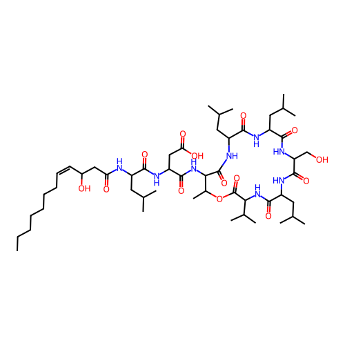 | SMILES | CCCCCCC/C=C\C(O)CC(=O)NC(CC(C)C)C(=O)NC(CC(=O)O)C(=O)NC1C(=O)NC(CC(C)C)C(=O)NC(CC(C)C)C(=O)NC(CO)C(=O)NC(CC(C)C)C(=O)NC(C(C)C)C(=O)OC1C |