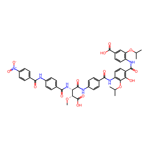 | SMILES | CO[C@@H](C(=O)O)[C@H](NC(=O)C1=CC=C(NC(=O)C2=CC=C([N+](=O)[O-])C=C2)C=C1)C(=O)NC1=CC=C(C(=O)NC2=C(OC(C)C)C(O)=C(C(=O)NC3=C(OC(C)C)C=C(C(=O)O)C=C3)C=C2)C=C1 |