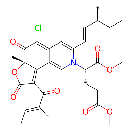 | SMILES | CC=C(C)C(=O)C1=C2C3=CN([C@@H](CCC(=O)OC)C(=O)OC)C(/C=C/[C@@H](C)CC)=CC3=C(Cl)C(=O)[C@@]2(C)OC1=O |