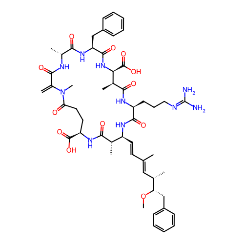 | SMILES | C[C@H]1[C@@H](NC(=O)[C@@H](NC(=O)[C@H]([C@@H](NC(=O)[C@@H](NC(=O)[C@H](NC(=O)C(=C)N(C(=O)CC[C@@H](NC1=O)C(=O)O)C)C)CC2=CC=CC=C2)C(=O)O)C)CCCN=C(N)N)/C=C/C(=C/[C@H](C)[C@H](CC3=CC=CC=C3)OC)/C |