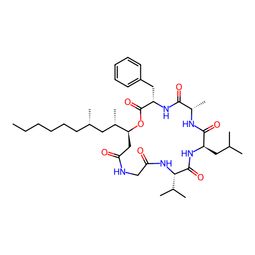 | SMILES | CCCCCC[C@H](C)C[C@H](C)[C@@H]1CC(=O)NCC(=O)N[C@@H](C(C)C)C(=O)N[C@H](CC(C)C)C(=O)N[C@@H](C)C(=O)N[C@@H](CC2=CC=CC=C2)C(=O)O1 |