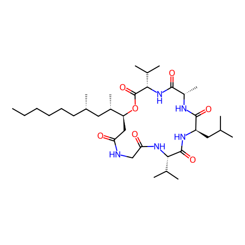 | SMILES | CCCCCC[C@H](C)C[C@H](C)[C@@H]1CC(=O)NCC(=O)N[C@@H](C(C)C)C(=O)N[C@H](CC(C)C)C(=O)N[C@@H](C)C(=O)N[C@@H](C(C)C)C(=O)O1 |