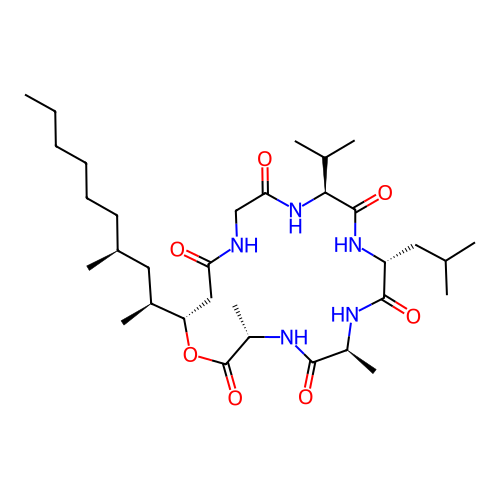 | SMILES | CCCCCC[C@H](C)C[C@H](C)[C@@H]1CC(=O)NCC(=O)N[C@@H](C(C)C)C(=O)N[C@H](CC(C)C)C(=O)N[C@@H](C)C(=O)N[C@@H](C)C(=O)O1 |