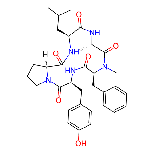 | SMILES | CC(C)C[C@@H]1NC(=O)[C@@H]2CCCN2C(=O)[C@H](CC2=CC=C(O)C=C2)NC(=O)[C@H](CC2=CC=CC=C2)N(C)C(=O)[C@H](C)NC1=O |
