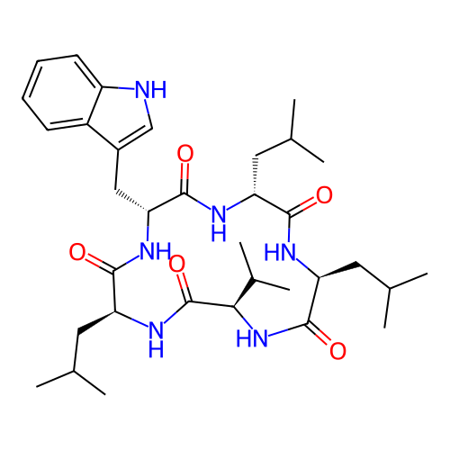 | SMILES | CC(C)C[C@@H]1NC(=O)[C@@H](CC(C)C)NC(=O)[C@@H](CC2=C[NH]C3=CC=CC=C23)NC(=O)[C@H](CC(C)C)NC(=O)[C@@H](C(C)C)NC1=O |