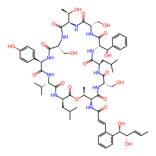 | SMILES | C/C=C/[C@H](O)[C@H](O)C1=CC=CC=C1/C=C/C(=O)N[C@@H]1C(=O)N[C@@H](CO)C(=O)N[C@H](CC(C)C)C(=O)N[C@@H]([C@H](O)C2=CC=CC=C2)C(=O)N[C@@H](CO)C(=O)N[C@H]([C@@H](C)O)C(=O)N[C@H](CO)C(=O)N[C@H](C2=CC=C(O)C=C2)C(=O)N[C@@H](C(C)C)C(=O)N[C@H](CC(C)C)C(=O)O[C@H]1C |