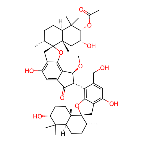 | SMILES | CO[C@@H]1C2=C3O[C@]4(CC3=C(O)C=C2C(=O)[C@H]1C1=C2O[C@]3(CC2=C(O)C=C1CO)[C@H](C)CC[C@H]1C(C)(C)[C@H](O)CC[C@@]13C)[C@H](C)CC[C@H]1C(C)(C)[C@H](OC(C)=O)[C@H](O)C[C@@]14C |