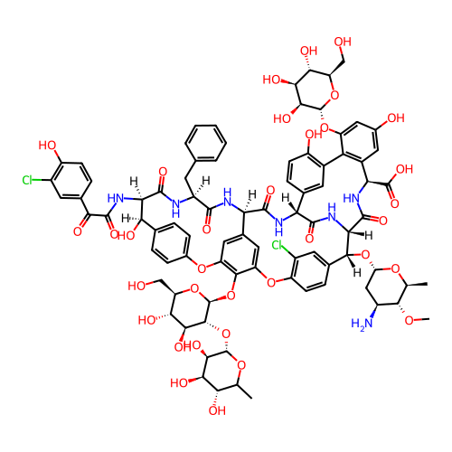 | SMILES | CO[C@@H]1[C@@H](N)C[C@H](O[C@@H]2C3=CC(Cl)=C(C=C3)OC3=CC4=CC(=C3O[C@@H]3O[C@H](CO)[C@@H](O)[C@H](O)[C@H]3O[C@@H]3OC(C)[C@H](O)[C@@H](O)[C@H]3O)OC3=CC=C(C=C3)[C@@H](O)[C@@H](NC(=O)C(=O)C3=CC(Cl)=C(O)C=C3)C(=O)N[C@@H](CC3=CC=CC=C3)C(=O)N[C@H]4C(=O)N[C@H]3C(=O)N[C@@H]2C(=O)N[C@H](C(=O)O)C2=C(C(O[C@H]4O[C@H](CO)[C@@H](O)[C@H](O)[C@@H]4O)=CC(O)=C2)C2=C(O)C=CC3=C2)O[C@H]1C |