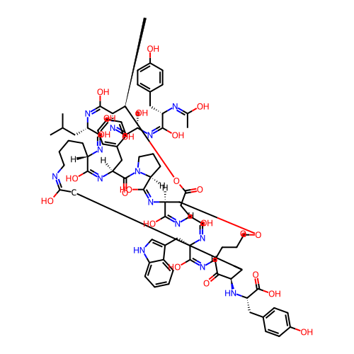 | SMILES | CC(O)=N[C@@H](CC1=CC=C(O)C=C1)C(O)=N[C@@H](CO)C(O)=N[C@@H]1C(O)=N[C@@H](CC(C)C)C(O)=N[C@H]2CCCCN=C(O)CC[C@@H](N[C@@H](CC3=CC=C(O)C=C3)C(=O)O)C(=O)[C@@H]3CCC(=O)OC[C@H](N=C(O)[C@@H]4CCCN4C(=O)[C@H](CC4=CC=C(O)C=C4)N=C2O)C(O)=N[C@@H](CC(=O)O[C@@H]1C)C(O)=N[C@@H](CC1=C[NH]C2=CC=CC=C12)C(O)=N3 |