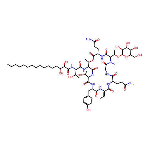 | SMILES | C/C=C1\NC(=O)C(CC2=CC=C(O)C=C2)NC(=O)C(C(C)O)NC(=O)C(NC(=O)C(NC(=O)C(O)C(O)CCCCCCCCCCCCC)C(C)O)C(C)OC(=O)C(CCC(N)=O)NC(=O)C(C(C)OC2OC(CO)C(O)C(O)C2O)N(C)C(=O)CNC(=O)C(CCC(N)=O)NC1=O |
