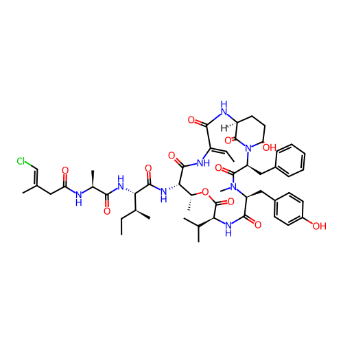 | SMILES | C/C=C1\NC(=O)[C@@H](NC(=O)[C@@H](NC(=O)[C@H](C)NC(=O)C/C(C)=C/Cl)[C@@H](C)CC)[C@@H](C)OC(=O)[C@H](C(C)C)NC(=O)[C@H](CC2=CC=C(O)C=C2)N(C)C(=O)[C@H](CC2=CC=CC=C2)N2C(=O)[C@H](CC[C@H]2O)NC1=O |