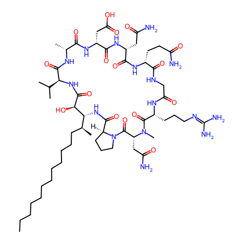 | SMILES | CCCCCCCCCCCC[C@H](C)[C@H]1NC(=O)[C@@H]2CCCN2C(=O)[C@@H](CC(N)=O)N(C)C(=O)[C@@H](CCCN=C(N)N)NC(=O)CNC(=O)[C@@H](CCC(N)=O)NC(=O)[C@@H](CC(N)=O)NC(=O)[C@@H](CC(=O)O)NC(=O)[C@@H](C)NC(=O)[C@H](C(C)C)NC(=O)[C@@H]1O |