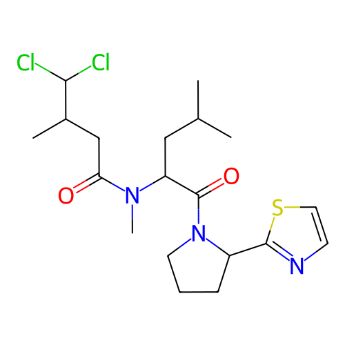 | SMILES | CC(C)CC(C(=O)N1CCCC1C1=NC=CS1)N(C)C(=O)CC(C)C(Cl)Cl |