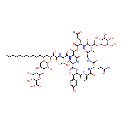 | SMILES | C/C=C1\NC(=O)C(C(O)C2=CC=C(O)C=C2)NC(=O)C(C(C)O)NC(=O)C(NC(=O)C(NC(=O)C(O)C(CCCCCCCCCCCCC)O[C@@H]2OC[C@@H](O)[C@@H](O[C@H]3O[C@@H](C(=O)O)[C@@H](O)[C@@H](O)[C@@H]3O)[C@@H]2O)C(C)O)C(C)OC(=O)[C@@H](CCC(N)=O)NC(=O)C(C(C)O[C@H]2O[C@@H](CO)[C@H](O)[C@@H](O)[C@H]2O)N(C)C(=O)CNC(=O)[C@H](CCC(N)=O)NC1=O |
