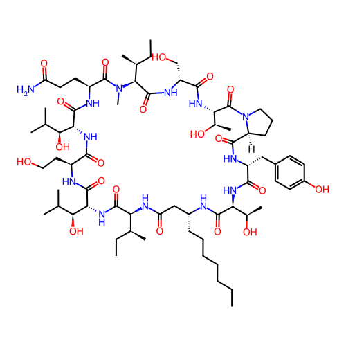 | SMILES | CCCCCCC[C@@H]1CC(=O)N[C@@H]([C@@H](C)CC)C(=O)N[C@H]([C@@H](O)C(C)C)C(=O)N[C@@H](CCO)C(=O)N[C@H]([C@@H](O)C(C)C)C(=O)N[C@@H](CCC(N)=O)C(=O)N(C)[C@@H]([C@@H](C)CC)C(=O)N[C@H](CO)C(=O)N[C@@H]([C@@H](C)O)C(=O)N2CCC[C@H]2C(=O)N[C@H](CC2=CC=C(O)C=C2)C(=O)N[C@@H]([C@@H](C)O)C(=O)N1 |