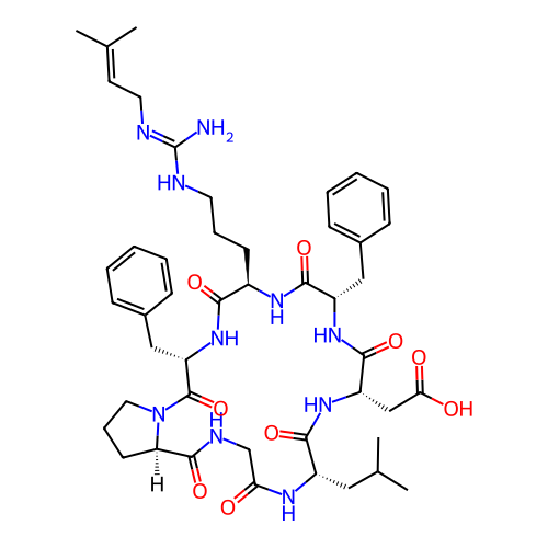 | SMILES | CC(C)=CCN=C(N)NCCC[C@H]1NC(=O)[C@H](CC2=CC=CC=C2)NC(=O)[C@H](CC(=O)O)NC(=O)[C@H](CC(C)C)NC(=O)CNC(=O)[C@H]2CCCN2C(=O)[C@H](CC2=CC=CC=C2)NC1=O |