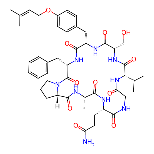 | SMILES | CC(C)=CCOC1=CC=C(C[C@@H]2NC(=O)[C@H](CO)NC(=O)[C@H](C(C)C)NC(=O)CNC(=O)[C@H](CCC(N)=O)NC(=O)[C@H](C)NC(=O)[C@@H]3CCCN3C(=O)[C@H](CC3=CC=CC=C3)NC2=O)C=C1 |