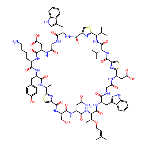 | SMILES | CC(C)=CCO[C@@H](C)[C@H]1NC(=O)[C@@H](CC(N)=O)NC(=O)[C@@H](CO)NC(=O)C2=CSC(=N2)[C@H](C)NC(=O)[C@@H](CC2=CC=C(O)C=C2)NC(=O)[C@@H](CCCCN)NC(=O)[C@@H](CC(=O)O)NC(=O)CNC(=O)[C@H](CC2=C[NH]C3=CC=CC=C23)NC(=O)C2=CSC(=N2)[C@@H](C(C)C)NC(=O)[C@@H](C(C)C)NC(=O)C2=CSC(=N2)[C@@H](CC(=O)O)NC(=O)CNC(=O)[C@@H](CC2=C[NH]C3=CC=CC=C23)NC1=O |