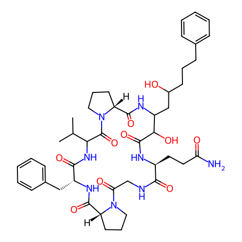 | SMILES | CC(C)C1NC(=O)[C@@H](CC2=CC=CC=C2)NC(=O)[C@H]2CCCN2C(=O)CNC(=O)[C@H](CCC(N)=O)NC(=O)C(O)C(CC(O)CCCC2=CC=CC=C2)NC(=O)[C@H]2CCCN2C1=O |