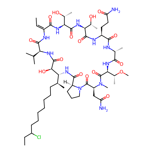 | SMILES | C/C=C1/NC(=O)[C@H](C(C)C)NC(=O)[C@H](O)[C@@H]([C@@H](C)CCCCCCCC(Cl)CC)NC(=O)[C@@H]2CCCN2C(=O)[C@H](CC(N)=O)N(C)C(=O)[C@H]([C@@H](C)OC)NC(=O)[C@@H](C)NC(=O)[C@H](CCC(N)=O)NC(=O)[C@H]([C@@H](C)O)NC(=O)[C@H]([C@@H](C)O)NC1=O |