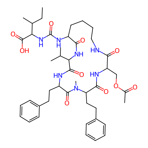 | SMILES | CCC(C)C(NC(=O)NC1CCCCNC(=O)C(COC(C)=O)NC(=O)C(CCC2=CC=CC=C2)N(C)C(=O)C(CCC2=CC=CC=C2)NC(=O)C(C(C)C)NC1=O)C(=O)O |