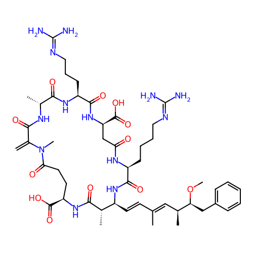 | SMILES | C=C1C(=O)N[C@H](C)C(=O)N[C@@H](CCCN=C(N)N)C(=O)N[C@@H](C(=O)O)CC(=O)N[C@@H](CCCCN=C(N)N)C(=O)N[C@@H](/C=C/C(C)=C/[C@H](C)[C@H](CC2=CC=CC=C2)OC)[C@H](C)C(=O)N[C@@H](C(=O)O)CCC(=O)N1C |