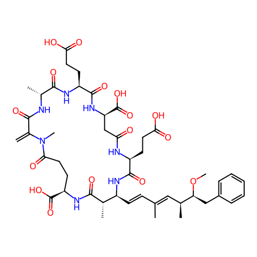 | SMILES | C=C1C(=O)N[C@H](C)C(=O)N[C@@H](CCC(=O)O)C(=O)N[C@@H](C(=O)O)CC(=O)N[C@@H](CCC(=O)O)C(=O)N[C@@H](/C=C/C(C)=C/[C@H](C)[C@H](CC2=CC=CC=C2)OC)[C@H](C)C(=O)N[C@@H](C(=O)O)CCC(=O)N1C |