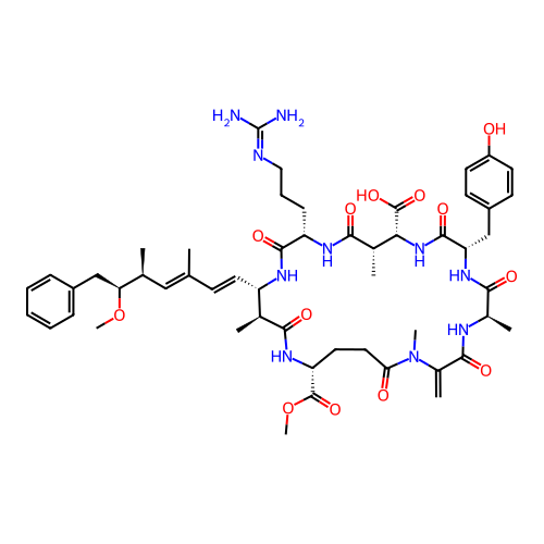 | SMILES | C=C1C(=O)N[C@H](C)C(=O)N[C@@H](CC2=CC=C(O)C=C2)C(=O)N[C@@H](C(=O)O)[C@H](C)C(=O)N[C@@H](CCCN=C(N)N)C(=O)N[C@@H](/C=C/C(C)=C/[C@H](C)[C@H](CC2=CC=CC=C2)OC)[C@H](C)C(=O)N[C@@H](C(=O)OC)CCC(=O)N1C |