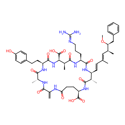 | SMILES | C=C1NC(=O)CC[C@H](C(=O)O)NC(=O)[C@@H](C)[C@H](/C=C/C(C)=C/[C@H](C)[C@H](CC2=CC=CC=C2)OC)NC(=O)[C@H](CCCN=C(N)N)NC(=O)[C@@H](C)[C@H](C(=O)O)NC(=O)[C@H](CCC2=CC=C(O)C=C2)NC(=O)[C@@H](C)NC1=O |