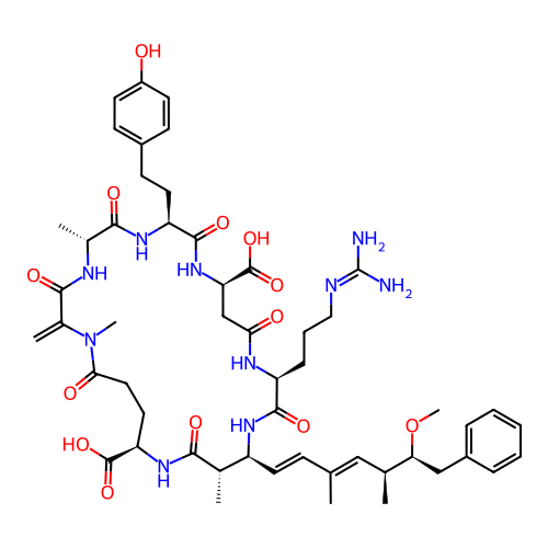 | SMILES | C=C1C(=O)N[C@H](C)C(=O)N[C@@H](CCC2=CC=C(O)C=C2)C(=O)N[C@@H](C(=O)O)CC(=O)N[C@@H](CCCN=C(N)N)C(=O)N[C@@H](/C=C/C(C)=C/[C@H](C)[C@H](CC2=CC=CC=C2)OC)[C@H](C)C(=O)N[C@@H](C(=O)O)CCC(=O)N1C |