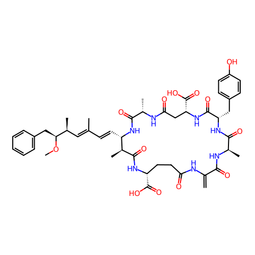 | SMILES | C=C1NC(=O)CC[C@H](C(=O)O)NC(=O)[C@@H](C)[C@H](/C=C/C(C)=C/[C@H](C)[C@H](CC2=CC=CC=C2)OC)NC(=O)[C@H](C)NC(=O)C[C@H](C(=O)O)NC(=O)[C@H](CC2=CC=C(O)C=C2)NC(=O)[C@@H](C)NC1=O |