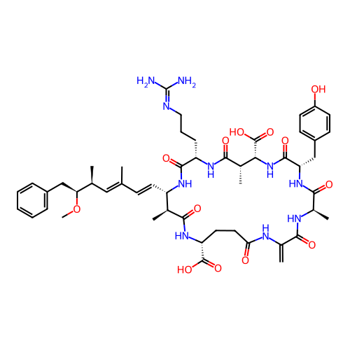 | SMILES | C=C1NC(=O)CC[C@H](C(=O)O)NC(=O)[C@@H](C)[C@H](/C=C/C(C)=C/[C@H](C)[C@H](CC2=CC=CC=C2)OC)NC(=O)[C@H](CCCN=C(N)N)NC(=O)[C@@H](C)[C@H](C(=O)O)NC(=O)[C@H](CC2=CC=C(O)C=C2)NC(=O)[C@@H](C)NC1=O |