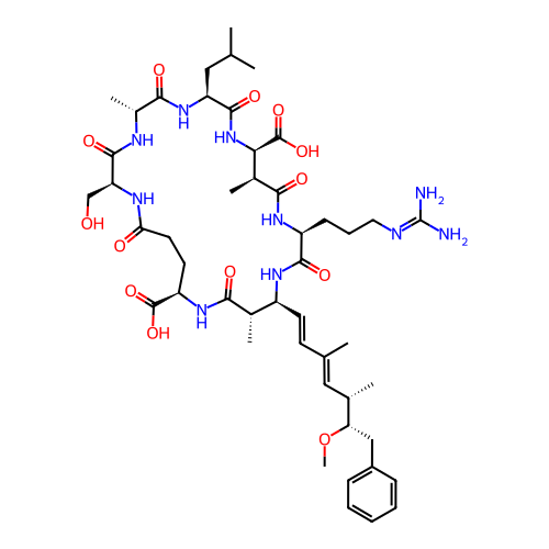 | SMILES | CO[C@@H](CC1=CC=CC=C1)[C@@H](C)/C=C(C)/C=C/[C@@H]1NC(=O)[C@H](CCCN=C(N)N)NC(=O)[C@@H](C)[C@H](C(=O)O)NC(=O)[C@H](CC(C)C)NC(=O)[C@@H](C)NC(=O)[C@H](CO)NC(=O)CC[C@H](C(=O)O)NC(=O)[C@H]1C |