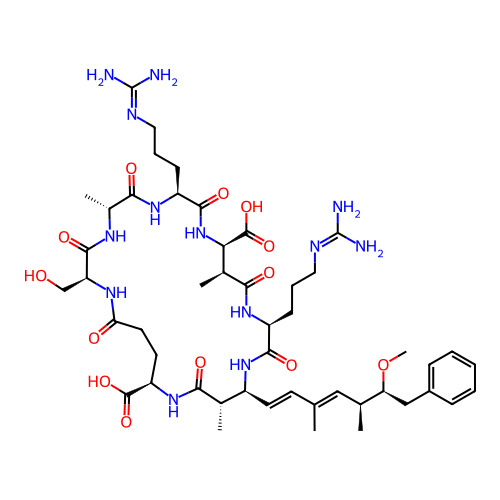| SMILES | CO[C@@H](CC1=CC=CC=C1)[C@@H](C)/C=C(C)/C=C/[C@@H]1NC(=O)[C@H](CCCN=C(N)N)NC(=O)[C@@H](C)[C@H](C(=O)O)NC(=O)[C@H](CCCN=C(N)N)NC(=O)[C@@H](C)NC(=O)[C@H](CO)NC(=O)CC[C@H](C(=O)O)NC(=O)[C@H]1C |
