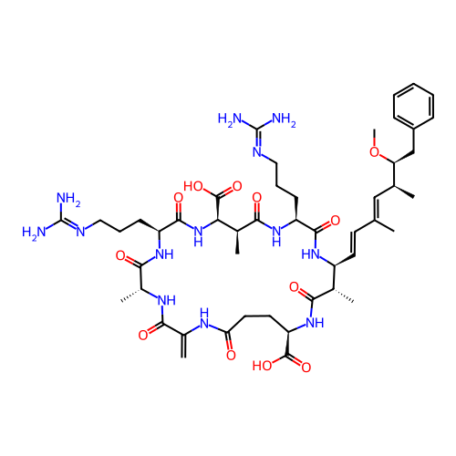| SMILES | C=C1NC(=O)CC[C@H](C(=O)O)NC(=O)[C@@H](C)[C@H](/C=C/C(C)=C/[C@H](C)[C@H](CC2=CC=CC=C2)OC)NC(=O)[C@H](CCCN=C(N)N)NC(=O)[C@@H](C)[C@H](C(=O)O)NC(=O)[C@H](CCCN=C(N)N)NC(=O)[C@@H](C)NC1=O |