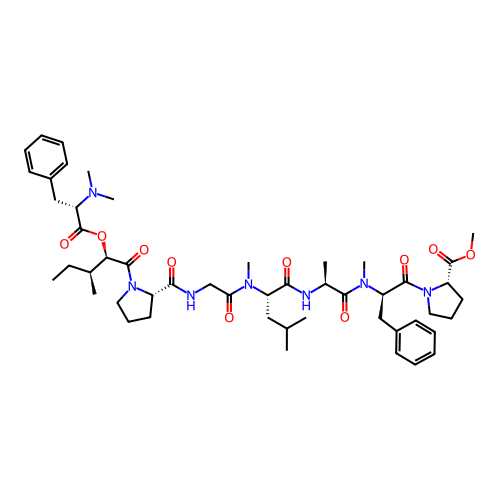 | SMILES | CC[C@H](C)[C@@H](OC(=O)[C@H](CC1=CC=CC=C1)N(C)C)C(=O)N1CCC[C@H]1C(=O)NCC(=O)N(C)[C@@H](CC(C)C)C(=O)N[C@@H](C)C(=O)N(C)[C@H](CC1=CC=CC=C1)C(=O)N1CCC[C@H]1C(=O)OC |