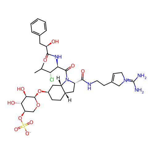 | SMILES | CC(C)[C@@H](Cl)[C@@H](NC(=O)[C@H](O)CC1=CC=CC=C1)C(=O)N1[C@H](C(=O)NCCC2=CC[N+](=C(N)N)C2)C[C@@H]2CC[C@@H](O[C@H]3OC[C@@H](OS(=O)(=O)[O-])[C@H](O)[C@H]3O)C[C@@H]21 |