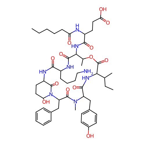 | SMILES | CCCCCC(=O)NC(CCC(=O)O)C(=O)NC1C(=O)NC(CCCCN)C(=O)NC2CCC(O)N(C2=O)C(CC2=CC=CC=C2)C(=O)N(C)C(CC2=CC=C(O)C=C2)C(=O)NC(C(C)CC)C(=O)OC1C |