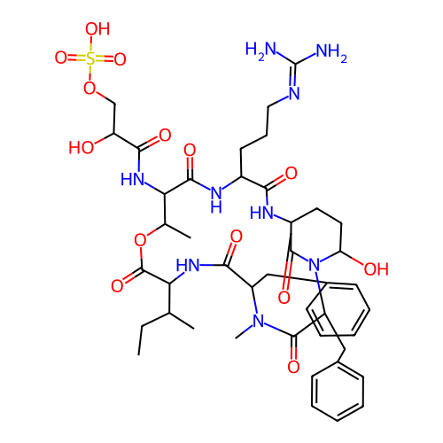 | SMILES | CCC(C)C1NC(=O)C(CC2=CC=CC=C2)N(C)C(=O)C(CC2=CC=CC=C2)N2C(=O)C(CCC2O)NC(=O)C(CCCN=C(N)N)NC(=O)C(NC(=O)C(O)COS(=O)(=O)O)C(C)OC1=O |