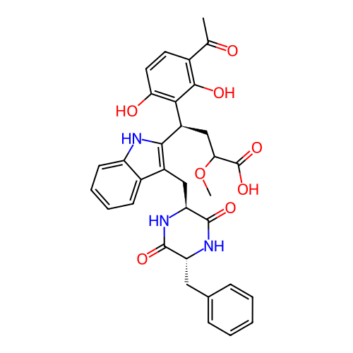 | SMILES | COC(C[C@@H](C1=C(C[C@@H]2NC(=O)[C@@H](CC3=CC=CC=C3)NC2=O)C2=CC=CC=C2[NH]1)C1=C(O)C=CC(C(C)=O)=C1O)C(=O)O |