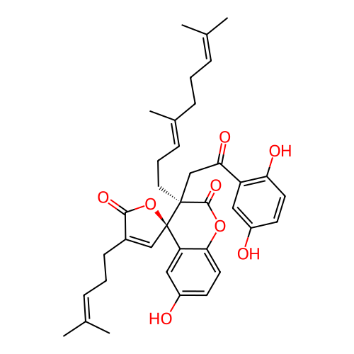 | SMILES | CC(C)=CCCC1=C[C@@]2(OC1=O)C1=CC(O)=CC=C1OC(=O)[C@]2(CC/C=C(\C)CCC=C(C)C)CC(=O)C1=C(O)C=CC(O)=C1 |