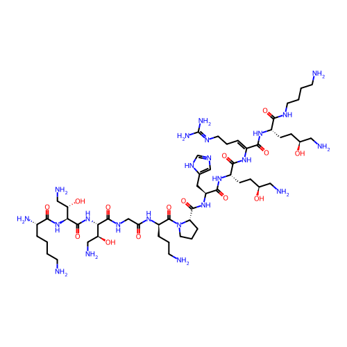 | SMILES | NCCCCNC(=O)[C@H](CC[C@H](O)CN)NC(=O)/C(=C/CCN=C(N)N)NC(=O)[C@H](CC[C@H](O)CN)NC(=O)[C@H](CC1=CN=C[NH]1)NC(=O)[C@@H]1CCCN1C(=O)[C@@H](CCCN)NC(=O)CNC(=O)[C@@H](NC(=O)[C@@H](NC(=O)[C@@H](N)CCCCN)[C@@H](O)CN)[C@@H](O)CN |
