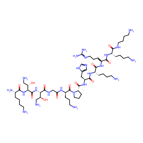 | SMILES | NCCCCNC(=O)[C@H](CCCCN)NC(=O)/C(=C/CCN=C(N)N)NC(=O)[C@H](CCCCN)NC(=O)[C@H](CC1=CN=C[NH]1)NC(=O)[C@@H]1CCCN1C(=O)[C@@H](CCCN)NC(=O)CNC(=O)[C@@H](NC(=O)[C@@H](NC(=O)[C@@H](N)CCCCN)[C@@H](O)CN)[C@@H](O)CN |