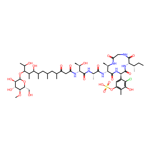 | SMILES | CC[C@H](C)[C@@H]1NC(=O)[C@@H](C2=CC(OS(=O)(=O)O)=C(C)C(O)=C2Cl)NC(=O)[C@H](NC(=O)[C@H](C)NC(=O)[C@H](NC(=O)CC(=O)C(C)CC(C)CC(C)C(O)C(C)C(OC2O[C@H](CO)[C@@H](OC)[C@H](O)[C@H]2O)C(C)O)[C@@H](C)O)[C@@H](C)NC(=O)CNC1=O |