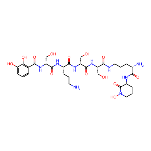 | SMILES | NCCC[C@H](NC(=O)[C@@H](CO)NC(=O)C1=C(O)C(O)=CC=C1)C(=O)N[C@H](CO)C(=O)N[C@@H](CO)C(=O)NCCC[C@H](N)C(=O)N[C@H]1CCCN(O)C1=O |